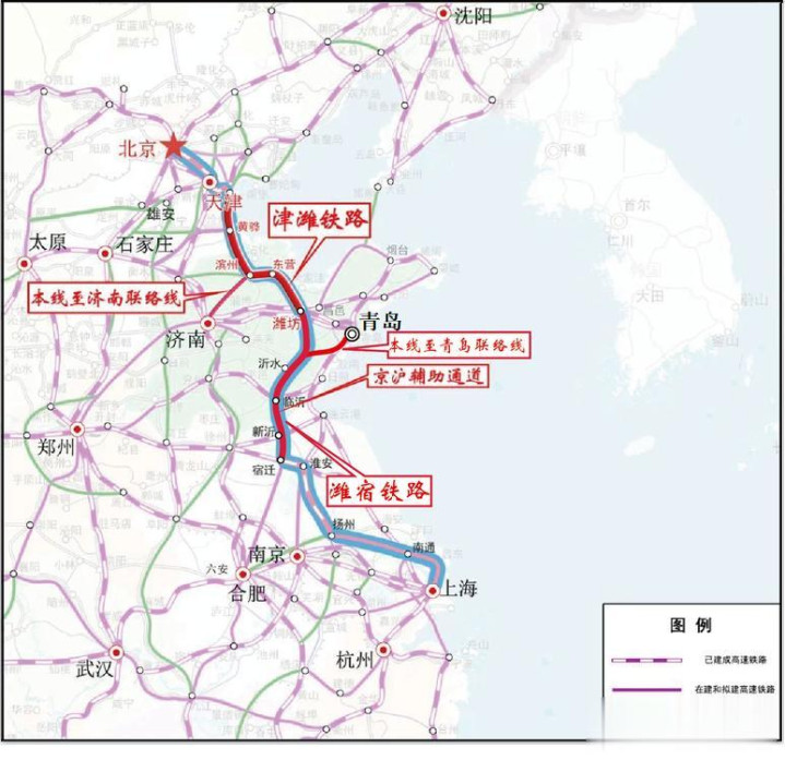 如今京沪第二高铁,直连苏北的同时,在山东半岛拐了一个弯。